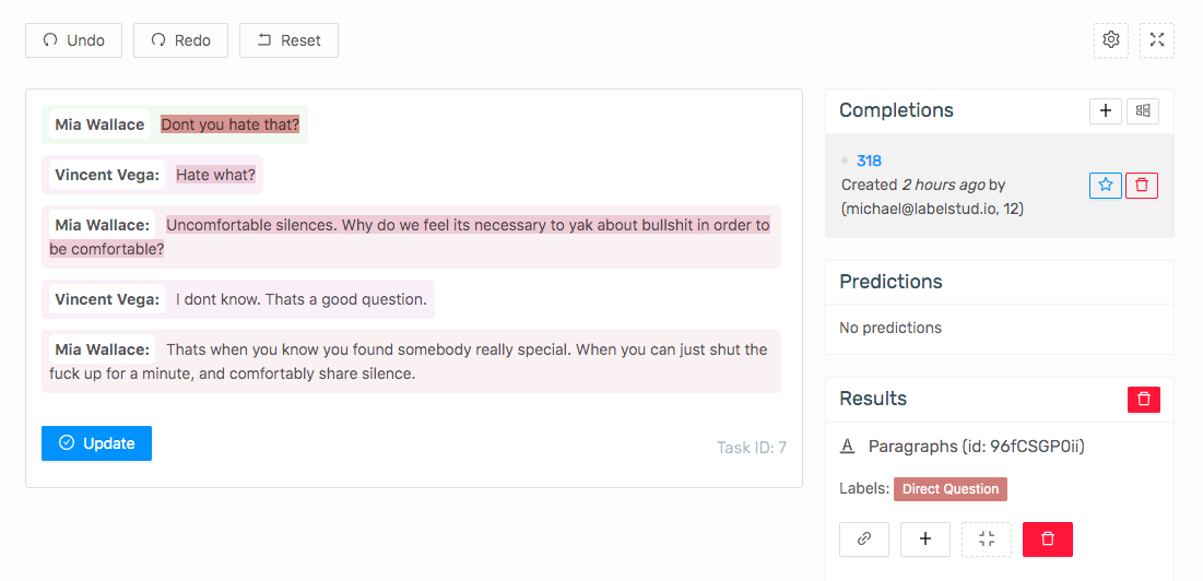 Introducing a new object tag called “Paragraphs”. A paragraph is a piece of text with potentially additional metadata like the author and the timestamp. With this tag we’re also experimenting now with an idea of providing predefined layouts. For example to label the dialogue you can use the following config: <Paragraphs name=“conversation” value=“$conv” layout=“dialogue” />