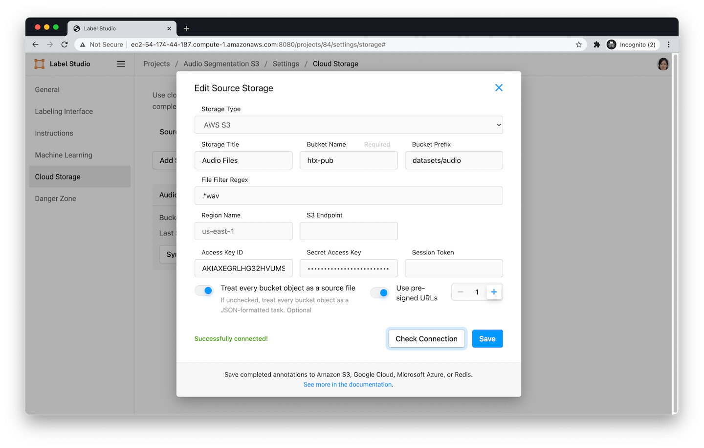 If you store your data in the cloud, Label Studio can natively sync with it. Out of the box you can configure Label Studio to read data from AWS S3, GCP, or Microsoft Azure. You can sync from multiple cloud providers or buckets at the same time, and each project can connect to a different cloud storage location.