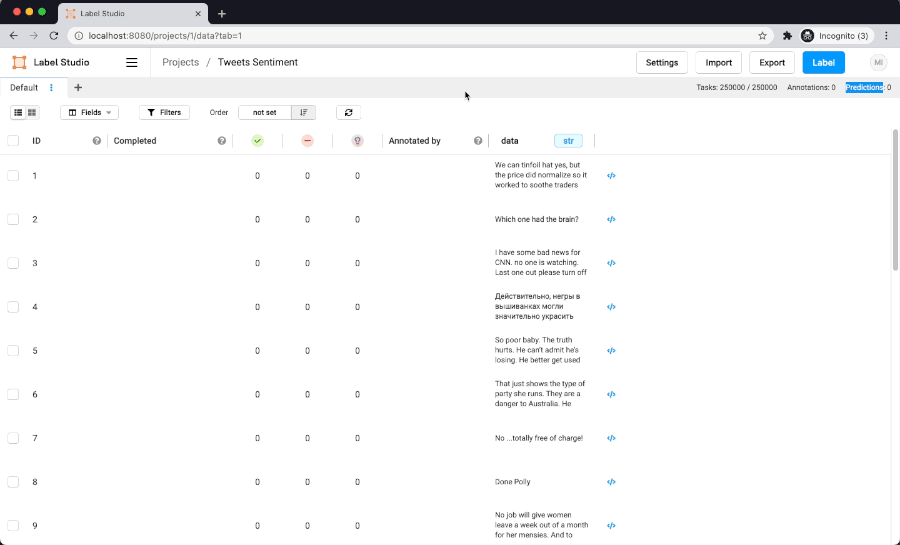 We migrated to a more robust backend from our enterprise version based on Django. We also transitioned from a filesystem-based to SQL-based data storage for tasks and annotations. While a filesystem is probably the simplest approach for storage, it doesn’t scale well when you work on datasets with more than 10,000 items. With SQLite as a storage backend, we can now easily upload datasets of hundreds of thousands of items.