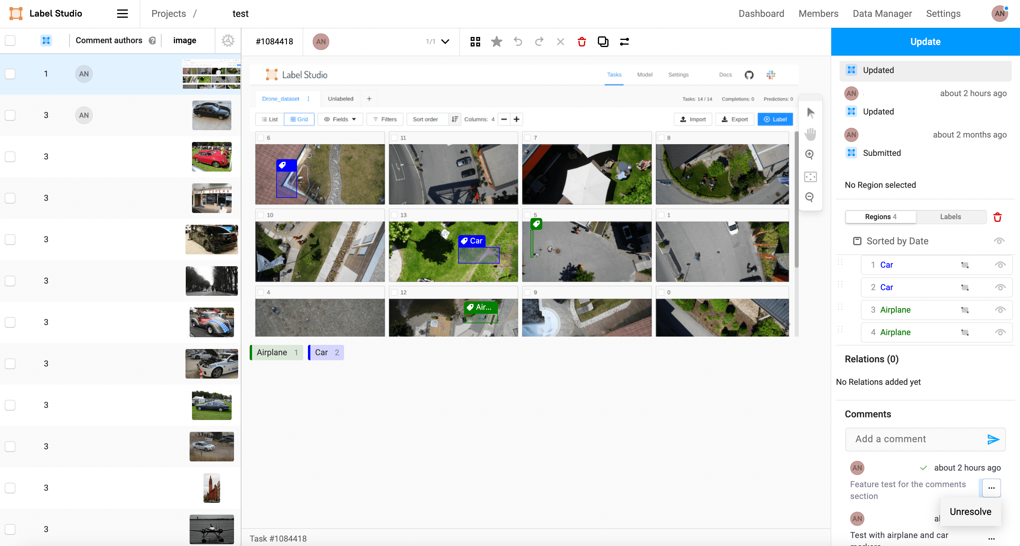 The Comments feature allows Annotators Reviewers and other higher roles to communicate and discuss queries on Label Studio Enterprise. Users will be notified of comments if they are associated with the task, and new comments will show up in the Notifications panel for a quick reference. Users can also filter and sort tasks by Comments status in the Data Manager view, such as finding tasks with unresolved comments from a particular user.