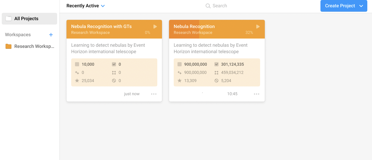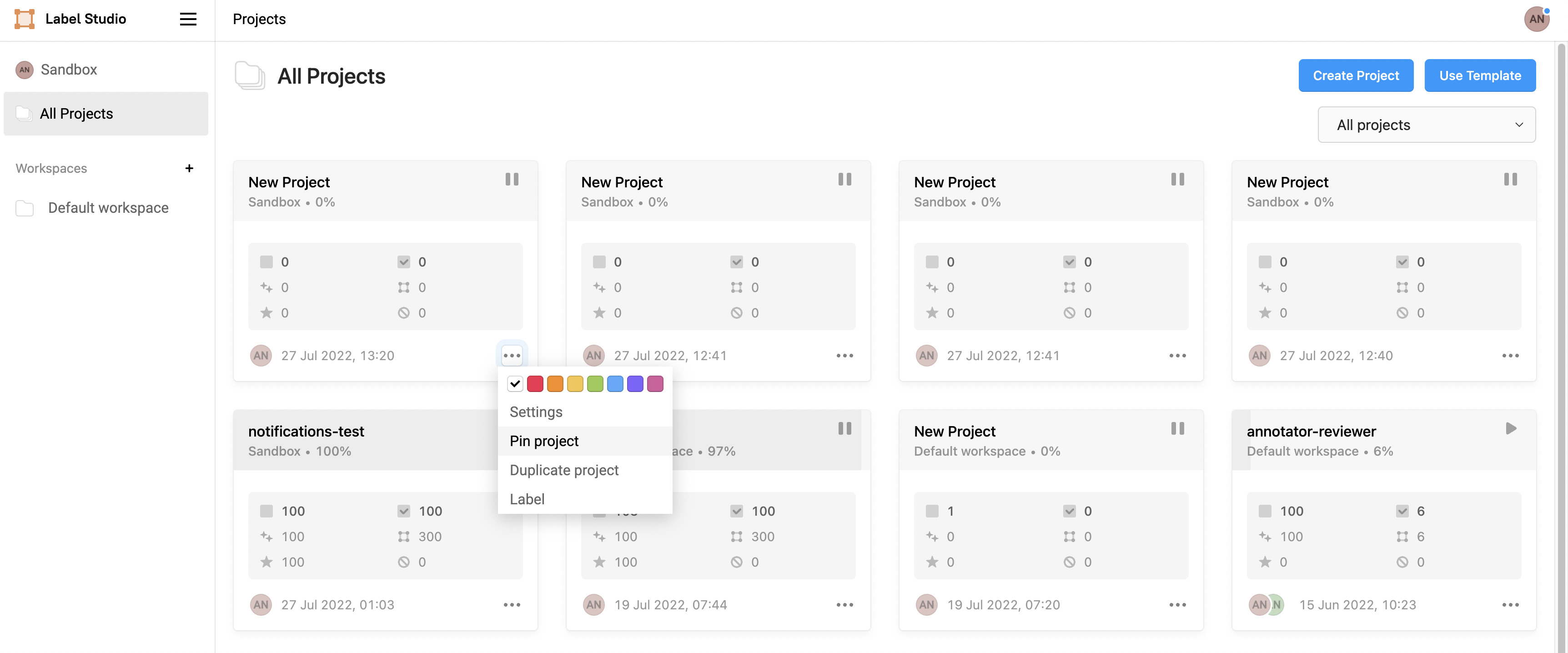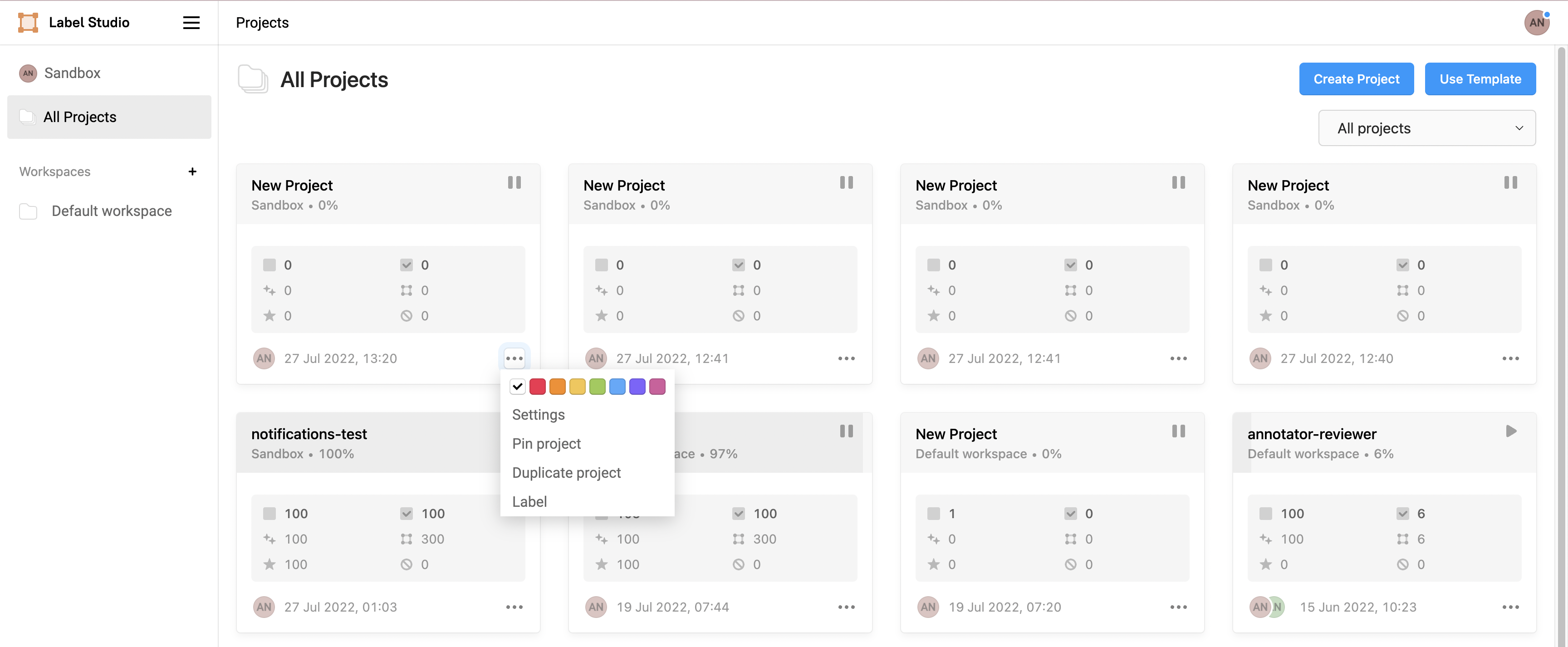The Duplicate project feature allows you to duplicate projects to a target workspace optionally importing the settings, tasks, and annotations. Duplicate a project by using the Project’s settings or Project card’s more menu (three dots …).