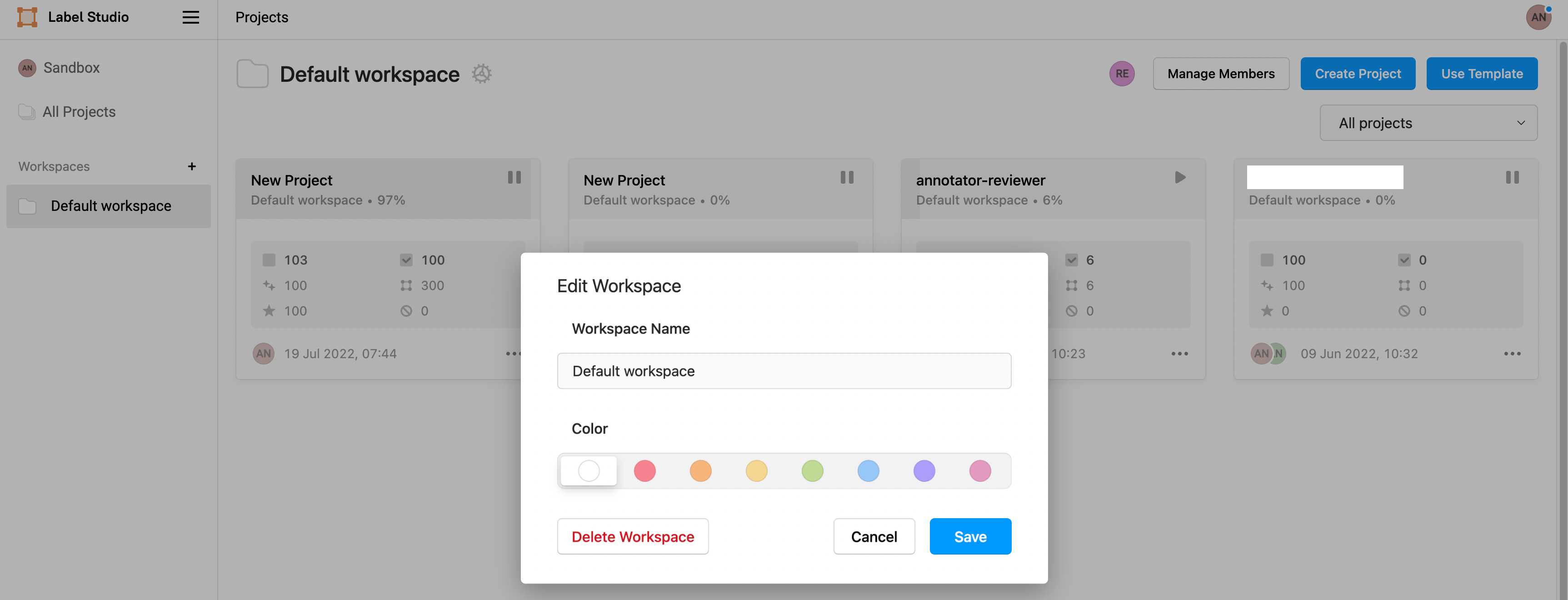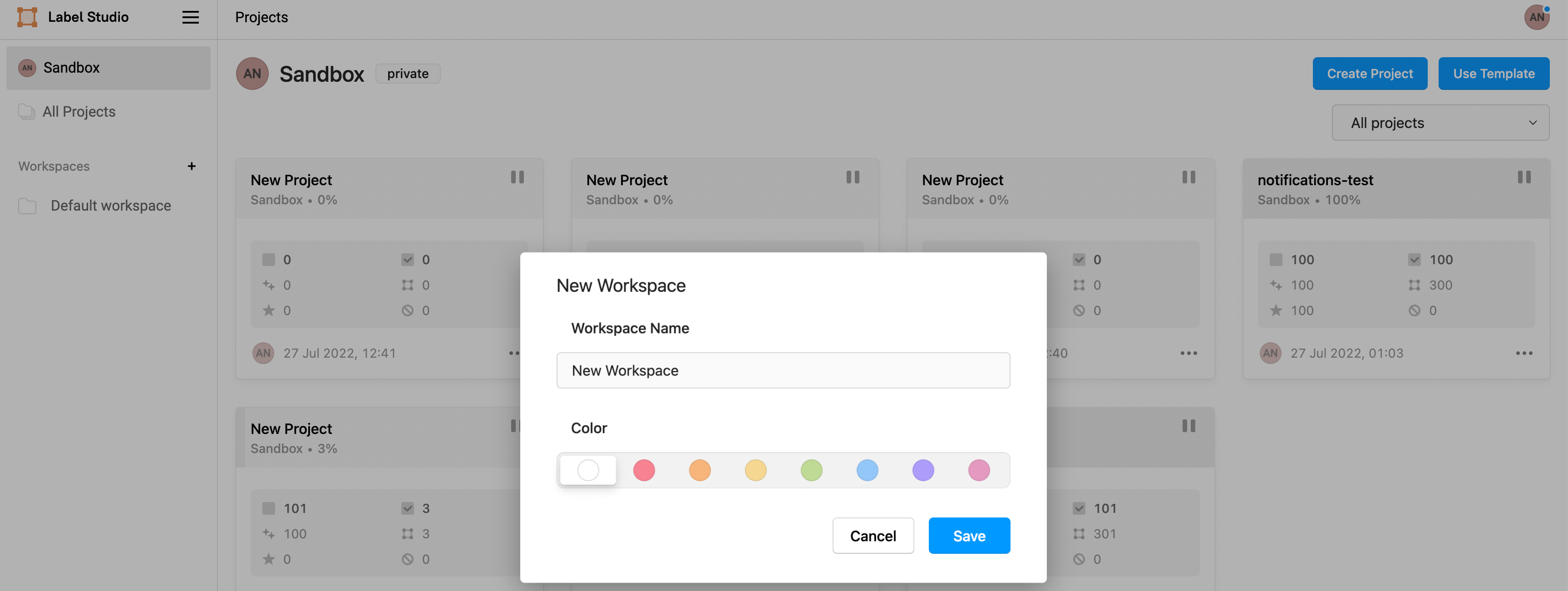 Each user has a personal Sandbox workspace that they can use to experiment with project settings and get familiar with Label Studio. After you set up a project and want others to collaborate on it with you, you can update the project workspace in the Project Settings. You cannot add members to your Sandbox workspace.