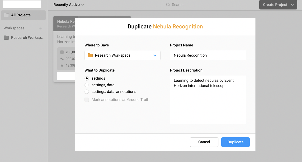 When choosing the last option, you also can choose if you would like to make annotations Ground Truth or not. In the Duplicate window, you can also give duplicated project new name and description.