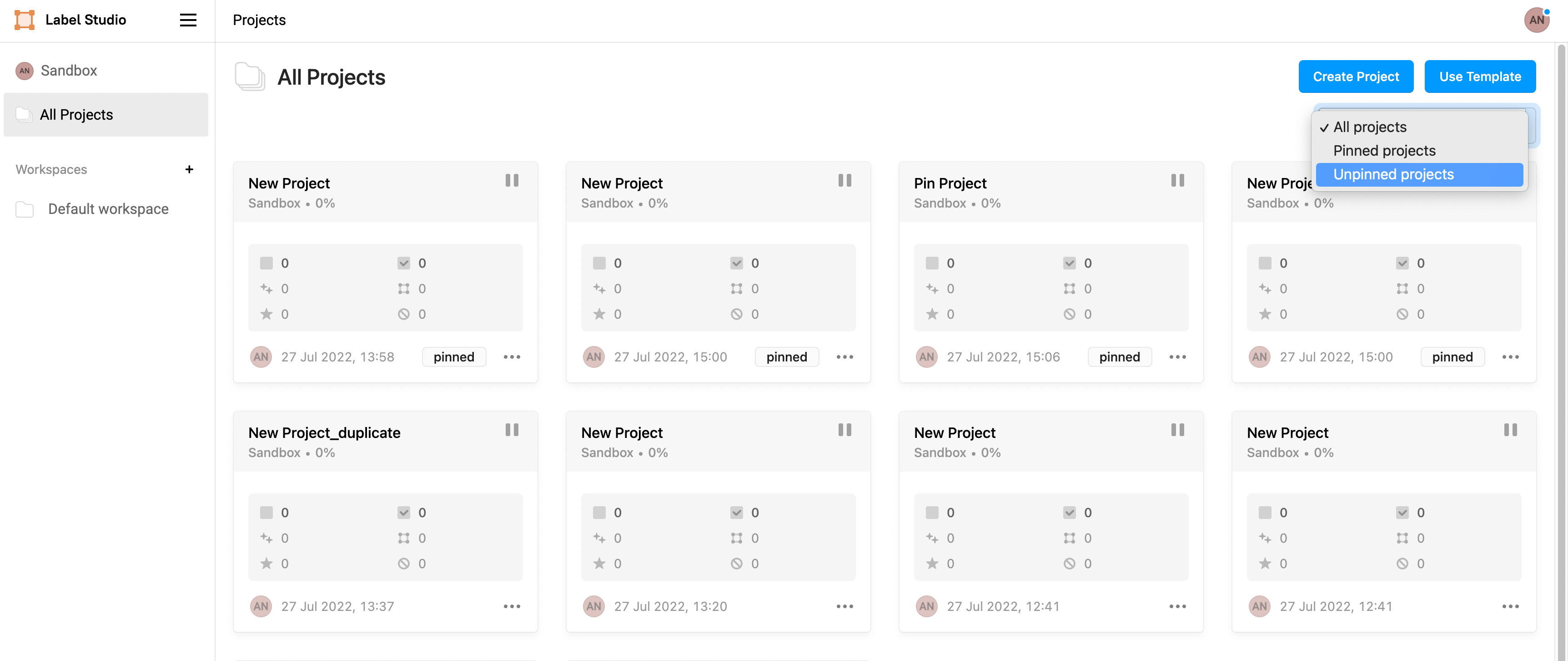- To filter and display only the unpinned projects, click Unpinned projects on the top-right side drop-down list.