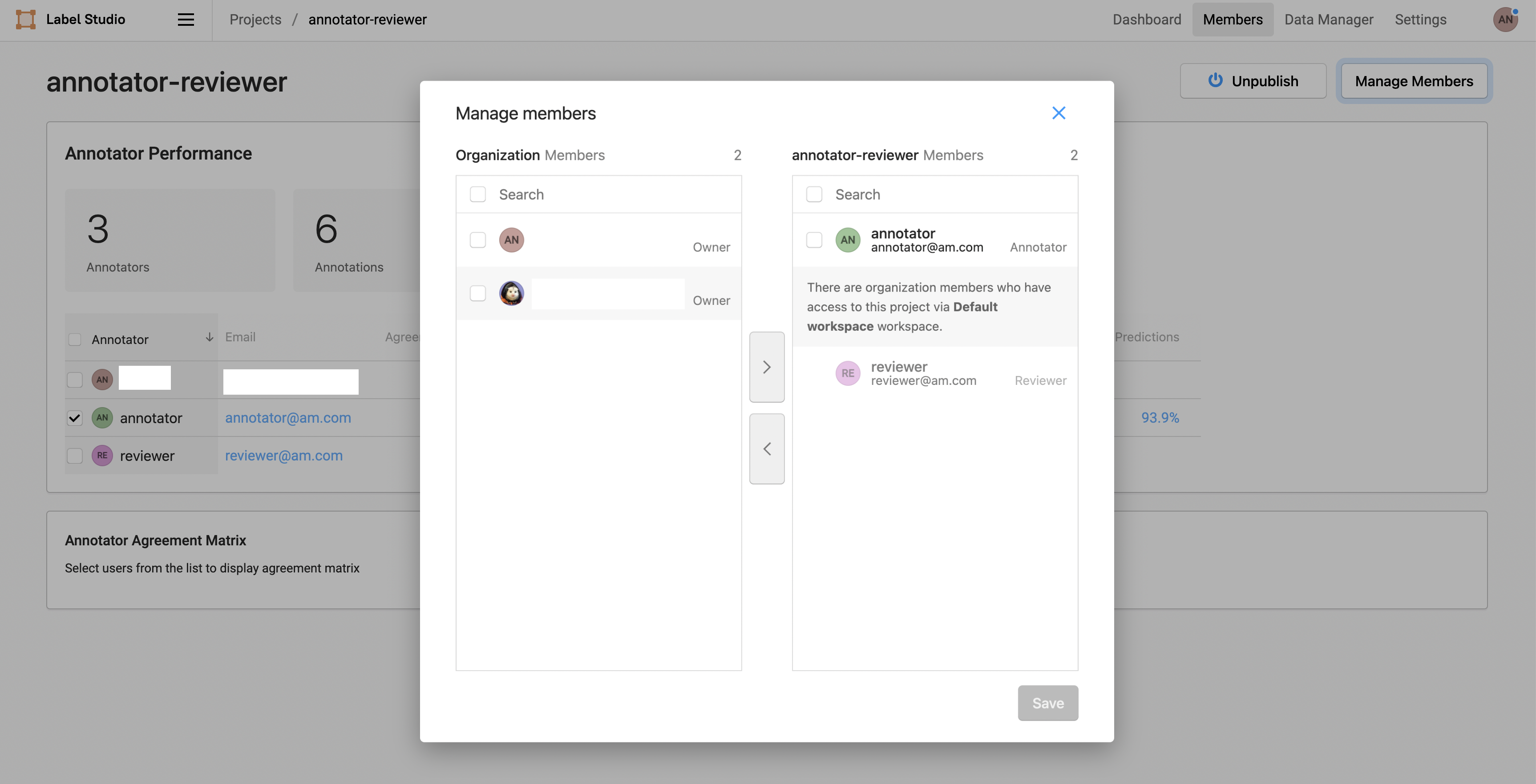 Managers within an organization can see all workspaces in that organization, even if they don’t have access to perform actions in them. Annotators and reviewers can only see projects, not workspaces.