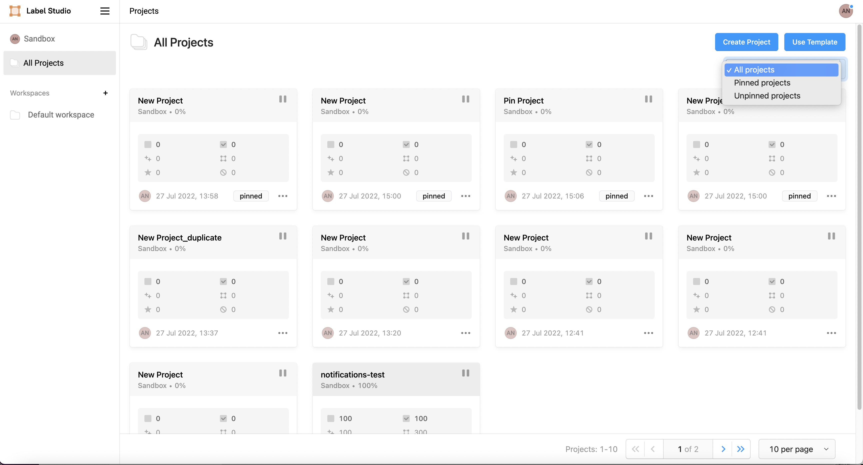 - To view all the projects (both the Pinned and Unpinned projects), click All projects on the top-right side drop-down list.