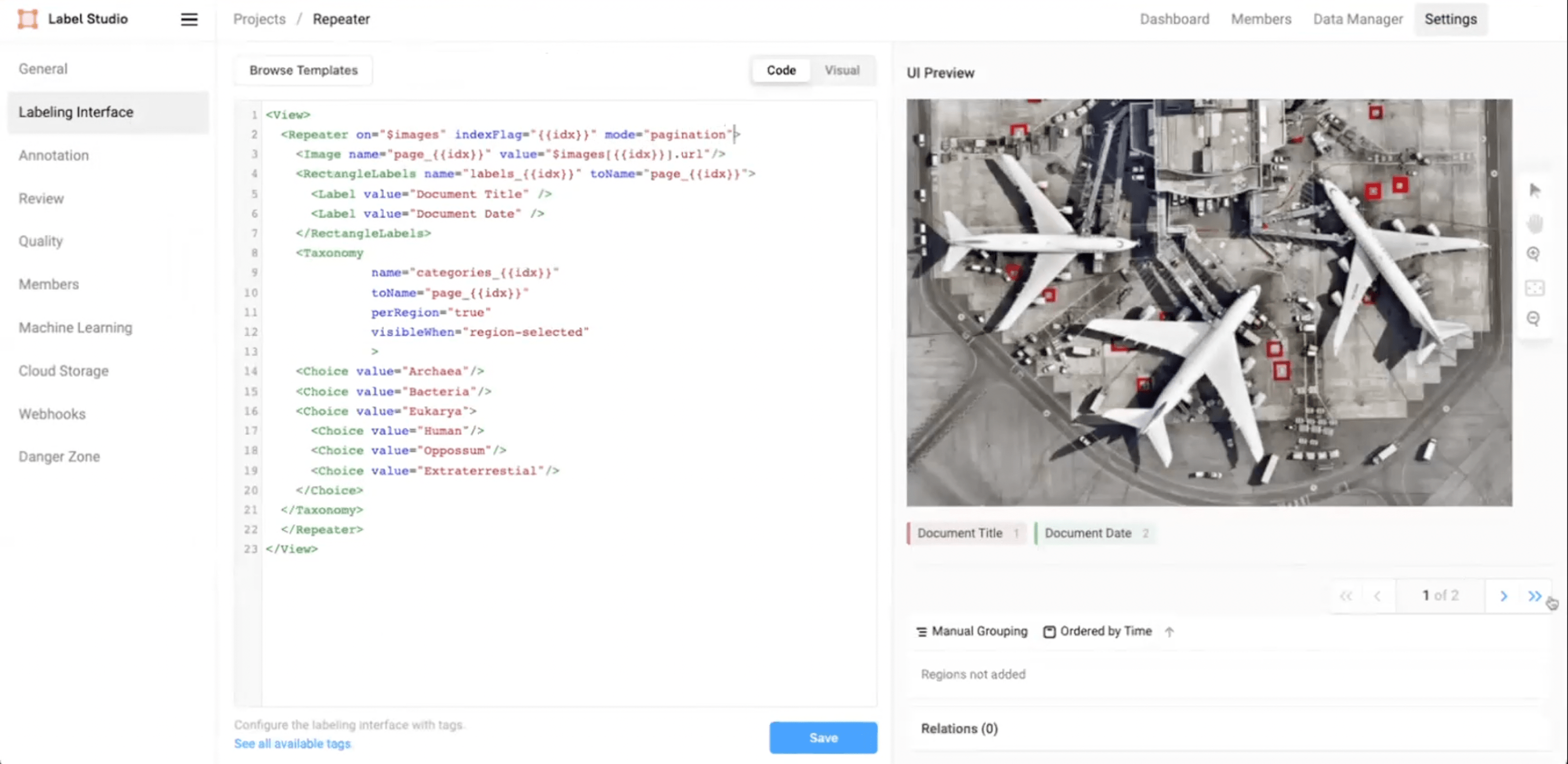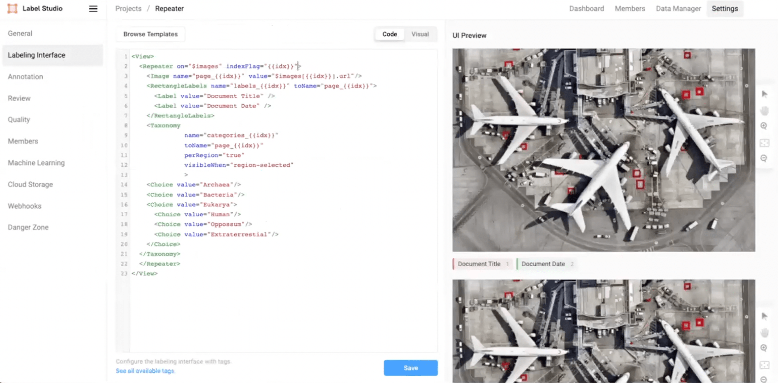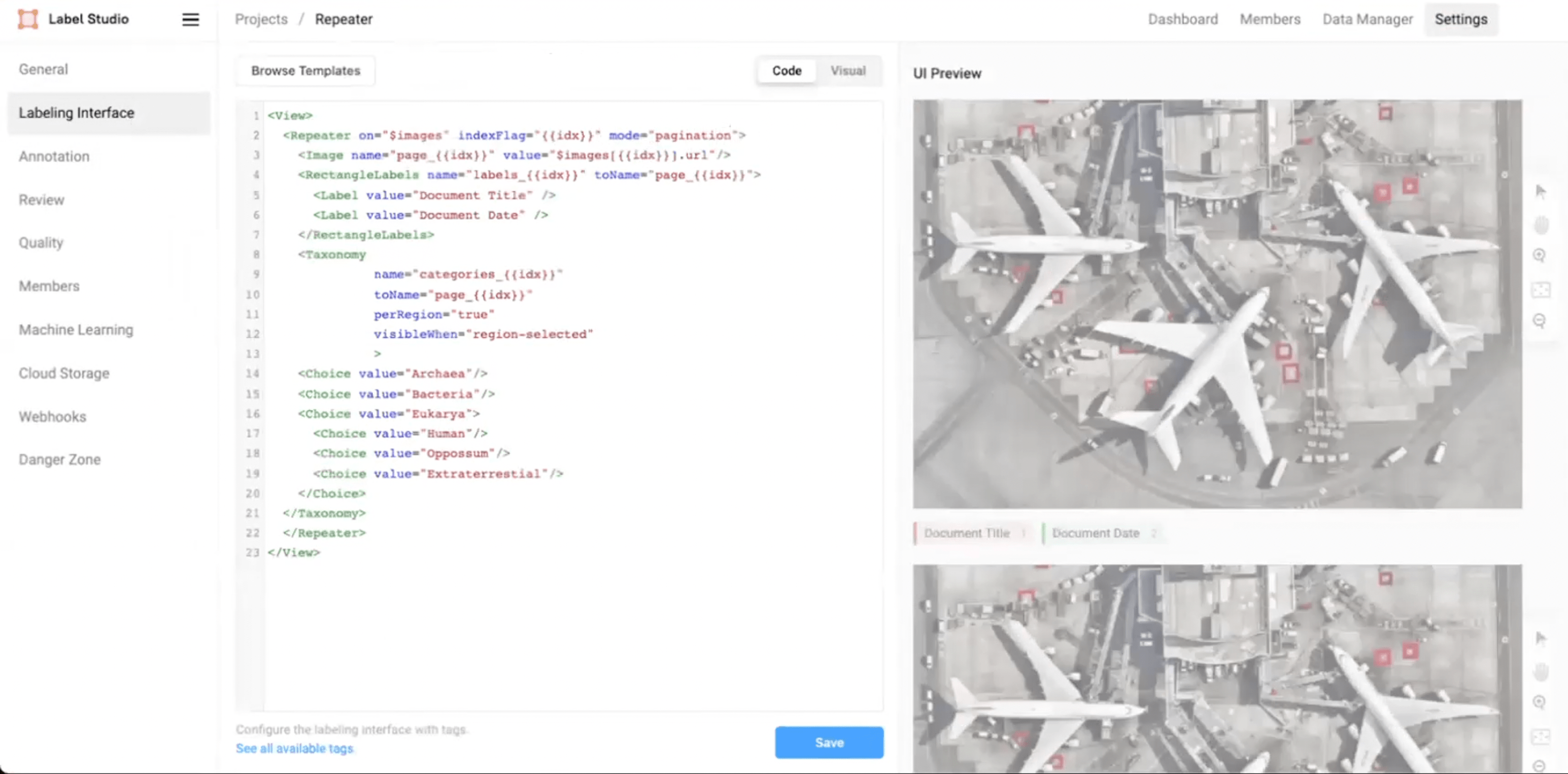 - In the Label Studio UI, navigate to Settings >> Labeling Interface >> Code.