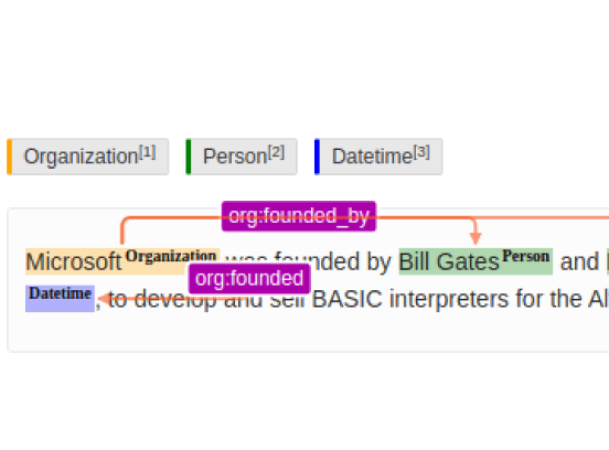 If you need to train a natural language processing model to perform relationship extraction tasks, use this template to create a dataset. This template prompts an annotator to label text spans and identify relationships between the spans. For example, identifying people and organizations, and adding relation arrows and labels to identify who founded an organization.